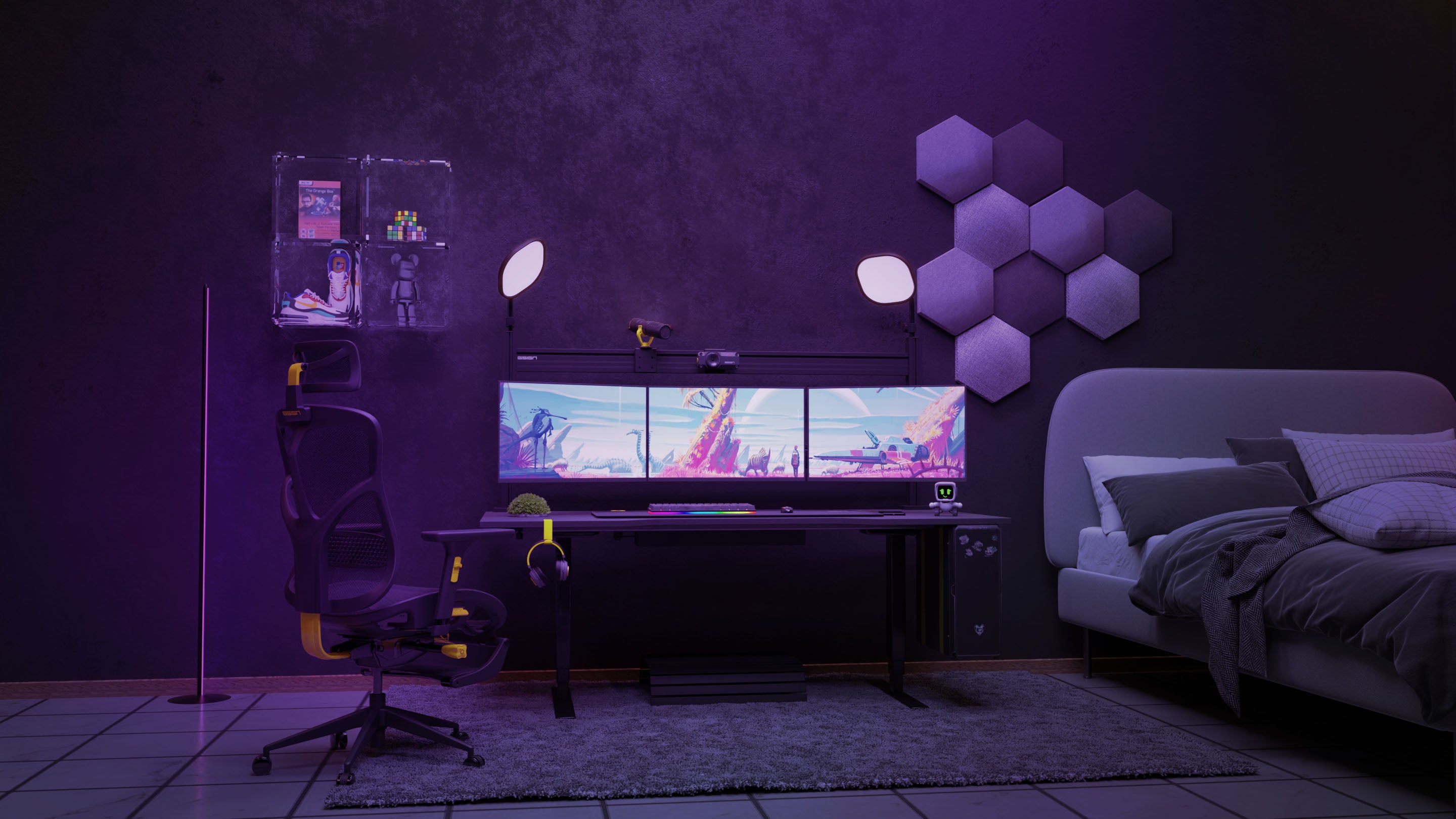 Höj- och sänkbara gamingbord, anpassningsbar gamingskärm, ljudabsorbenter, LED-lampor, och all annan utrustning för streaming. Ergonomiska gamingmöbler med fokus på att spelaren ska hålla helt enkelt.